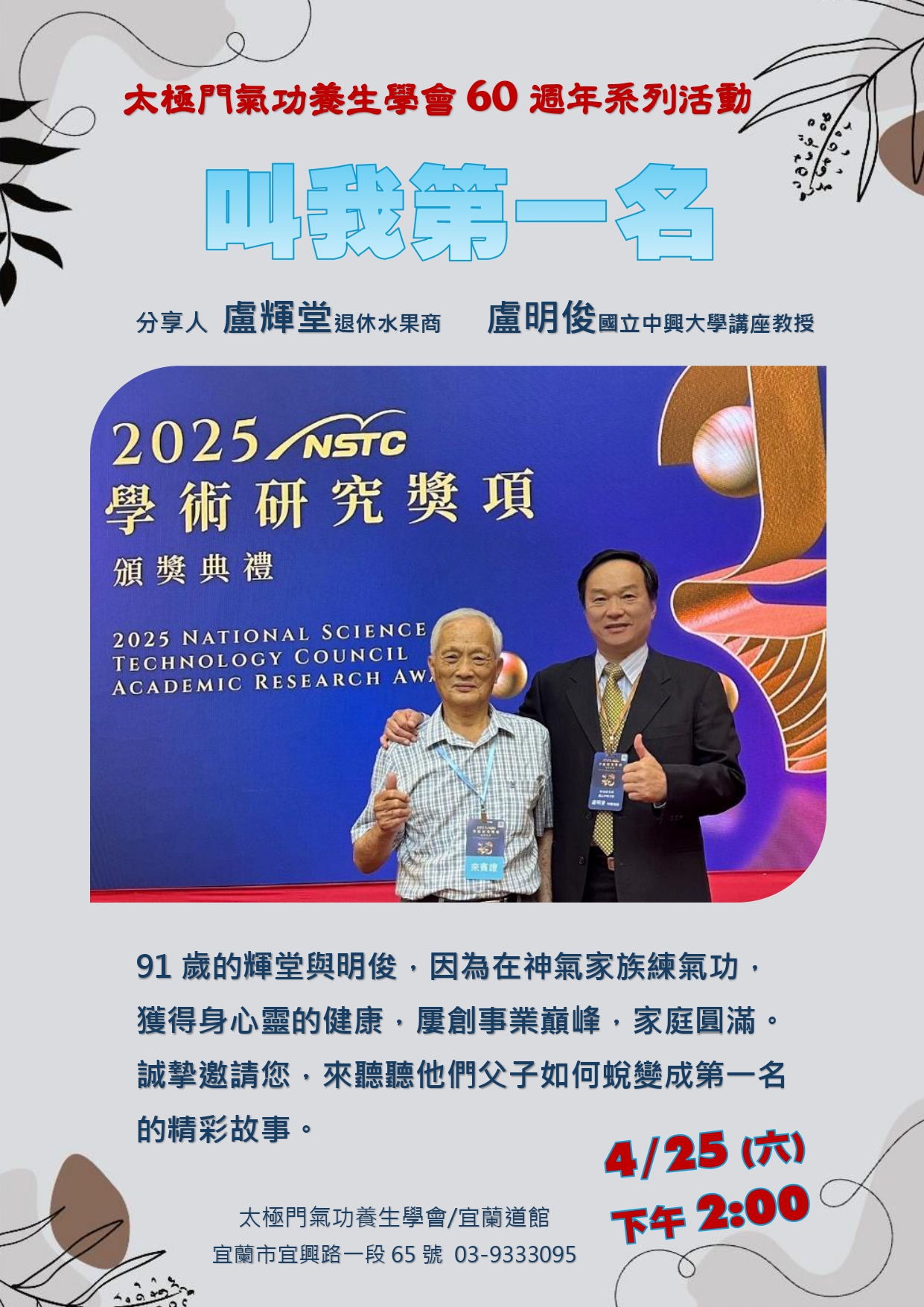 2026-04-25 14:00~15:30 宜蘭道館 (主講人:盧輝堂 (退休水果商)、盧明俊(大學教授))