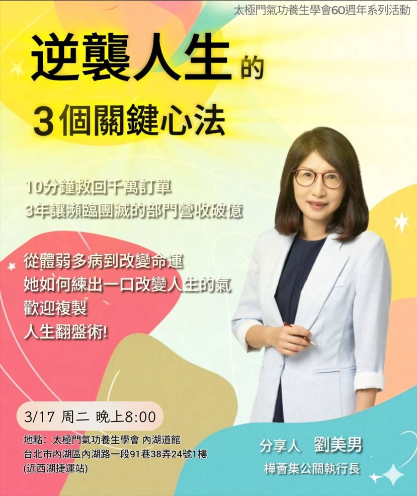 2026-03-17 20:00~21:00 內湖道館 (主講人:劉美男師姊(樺薈集公關執行長))