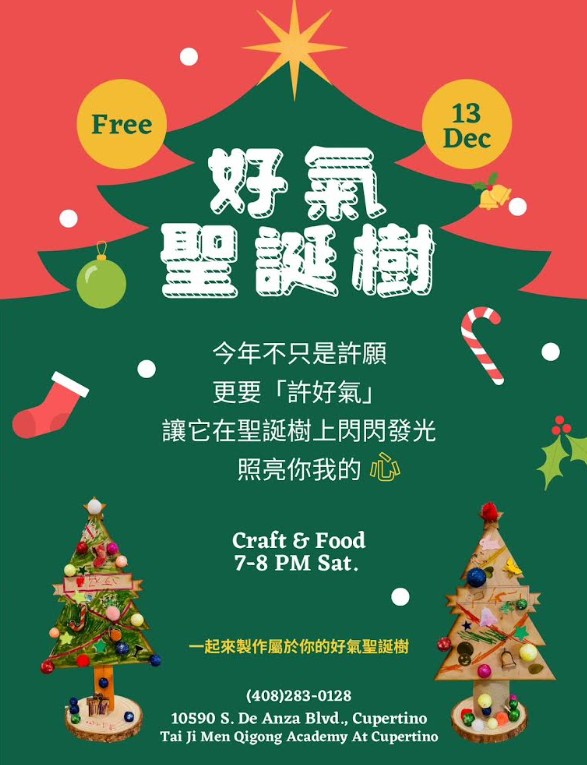 2025-12-13 7 pm~8 pm 庫比蒂諾道館 今年不只是許願更要「許好氣」讓它在聖誕樹上閃閃發光✨照亮你我的心一起來製作屬於你的好氣聖誕樹!