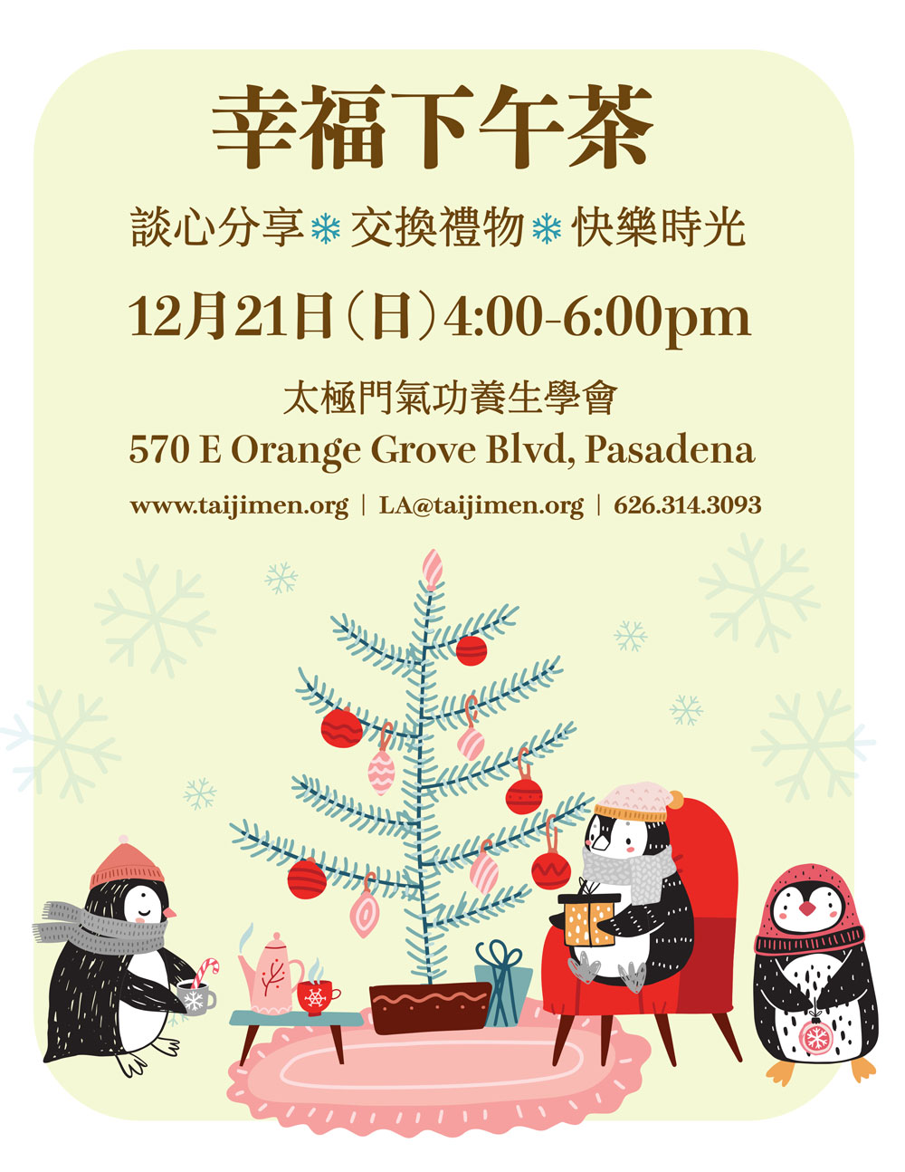 2025-12-21 4:00pm~6:00pm 帕薩迪納道館 談心分享 交換禮物 快樂時光12月21日(日)4:00-6:00pm太極門氣功養生學會570 E Orange Grove Blvd, Pasadena