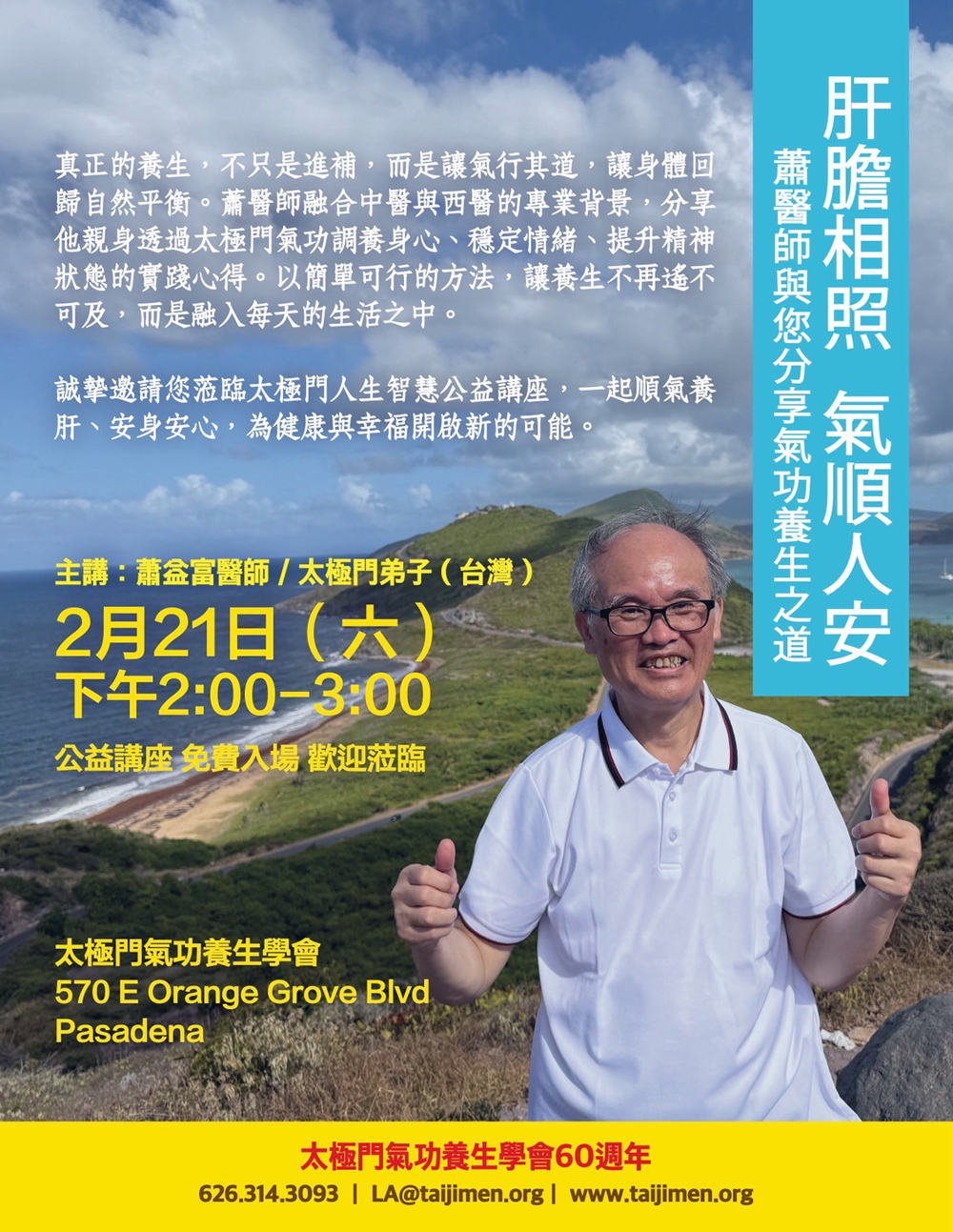 2026-02-21 2:00pm~3:00pm 帕薩迪納道館 (主講人:蕭益富醫師)真正的養生,不只是進補,而是讓氣行其道,讓身體回歸自然平衡。蕭醫師融合中醫與西醫的專業背景,分享他親身透過太極門氣功調養身心、穩定情緒、提升精神狀態的實踐心得。以簡單可行的方法,讓養生不再遙不可及,而...
