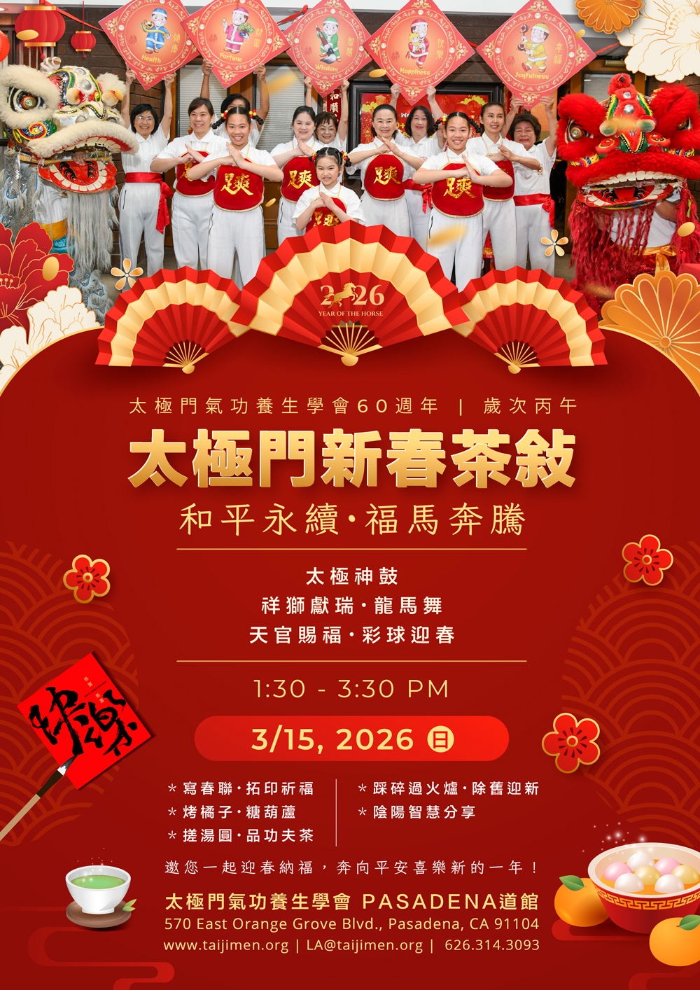 2026-03-15 1:30PM~3:30pm 帕薩迪納道館 太極門氣功養生學會60週年2026 太極門新春茶敘和平永續・福馬奔騰2026年3月15日(日)1:30–3:30 PM太極門 Pasadena 道館太極...
